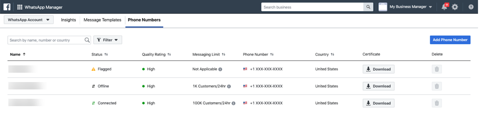 If your Quality Rating reaches a low state or your phone number status changes, you will receive an email and notification in Business Manager as a warning and your status will change to Flagged or Restricted.