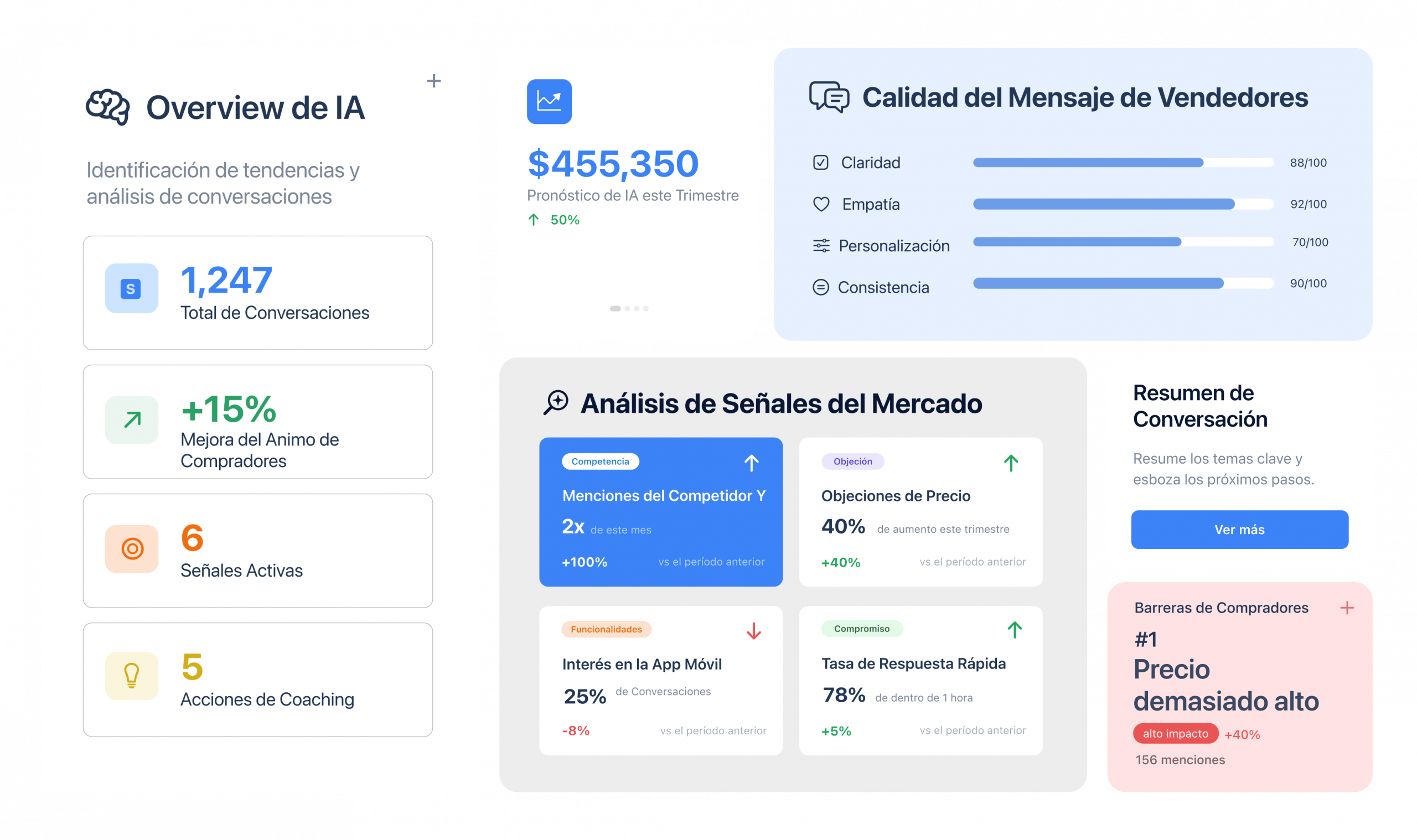 Ofrece una vista en tiempo real de lo que sucede en las conversaciones con clientes y brinda señales claras de demanda, objeciones e intención.